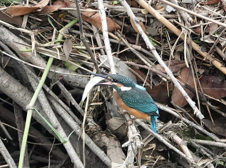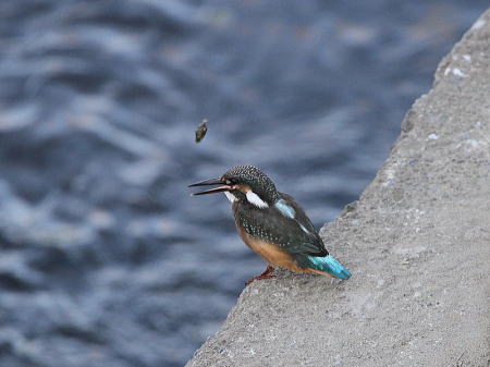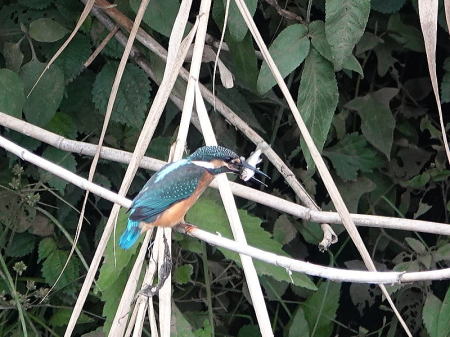 | カワセミ[7月7日] 荒天でお腹を空かしていたのか、続けて2匹獲りました。いただきまーす。 | カワセミ[7月7日] 若鳥です、見事に獲物を獲りました。 | |