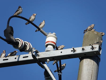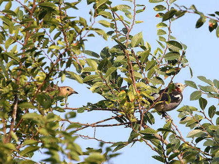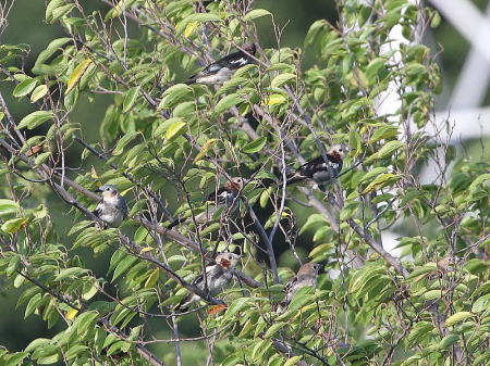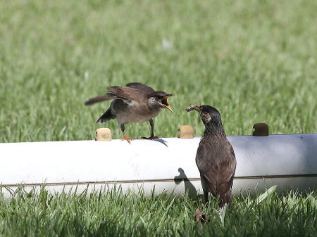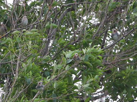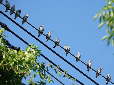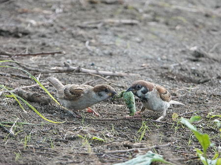 | スズメ[7月10日] 右のスズメが持て余していた青虫を、左の幼鳥がさっと取っていってしまいました。 | コムクドリ、ムクドリ[7月10日] ムクドリの大群の中にコムクドリが混じっていました。 | |