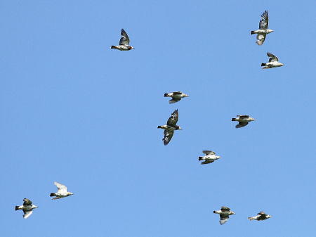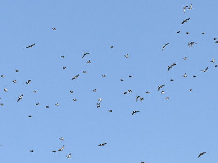 | コムクドリ[7月20日] 何処にも下りずに飛んで行ってしまいました。 | コムクドリ[7月20日] 遊水地の方から突然100羽以上の群れが現れました。 | |