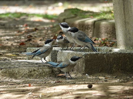 | オナガ[7月3日] 一番多く見かけたときは8羽いました。 | オナガ、ムクドリ[7月3日] オナガの幼鳥が遊んでいました。 | |