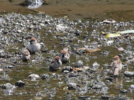 | スズメ[7月1日] 暑さのせいかも、行水は気持ちよさそうです。 | アオサギ[7月1日] 餌を探したり、休憩中だったり、この辺りに11羽いました。 |