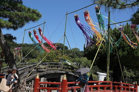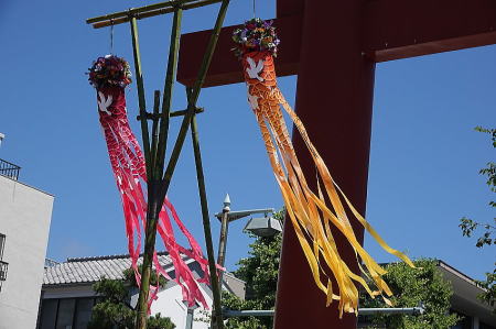 | 鶴岡八幡宮[7月2日] 例年通り舞殿にも。 | 鶴岡八幡宮[7月2日] 太鼓橋にも沢山の吹流しが飾られていました。 | |