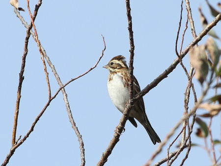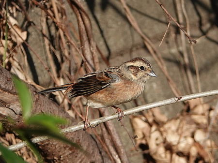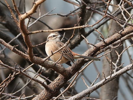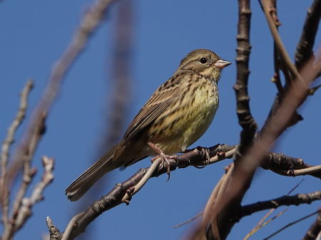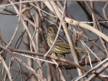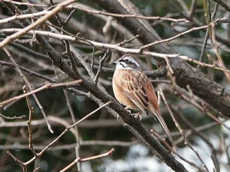 | ホオジロ[12月19日] ♀が川辺の木に飛んで来ました。 | ホオジロ[12月19日] 少し先の枝には♂が、いつも2羽で動いています。 | |