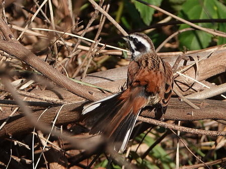 | ジョウビタキ[12月19日] 同じ川辺にジョウビタキも。ちっともじっとしていません。 | ホオジロ[12月17日] 草叢からやっと出て来ました。 | |