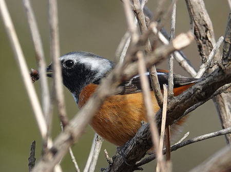 | モズ[12月30日] 歩道の植込みに飛んで来て向かい側を狙っていました。 | ジョウビタキ[12月30日] 飛び降りたかと思うと一瞬で虫を獲って来ました。 | |