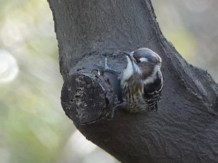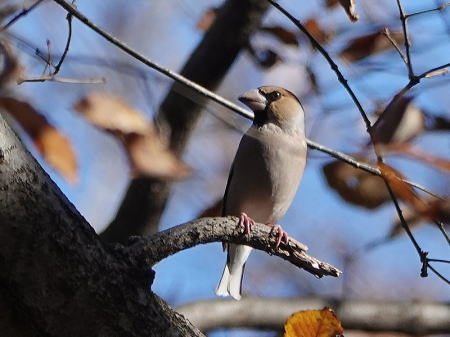 | コゲラ[12月30日] 前からも横からも突いていますが虫が獲れた様子はありません。 | シメ[12月30日] 先日のとは違う個体のようです。 | |