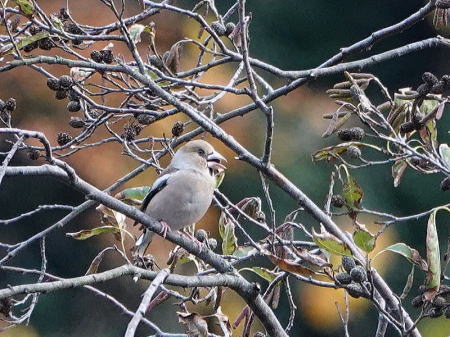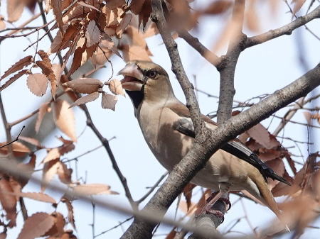 | ヤマガラ[12月26日] 何があるのかしきりに突いていました。 | シメ[12月26日] ケヤキの実を食べていました。 | |