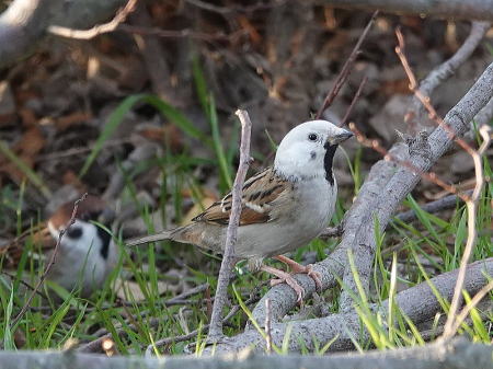 | スズメ[12月25日] 20羽程の中に部分白化したのが1羽居ました。 | スズメ[12月25日] 地面に落ちた何かをとって食べています。 | |