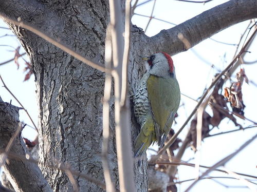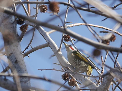 | アオゲラ[1月5日] 姿を見るのは久しぶりです。 | アオゲラ[1月5日] 木々の間を飛び回っていました。 | |