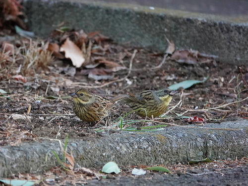 | アオジ[1月11日] よく見かけるようになりました。 | スズメ[1月11日] 採餌しにすぐそばの地面に下りました。 | |