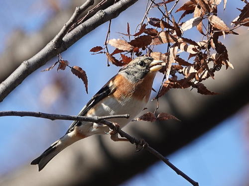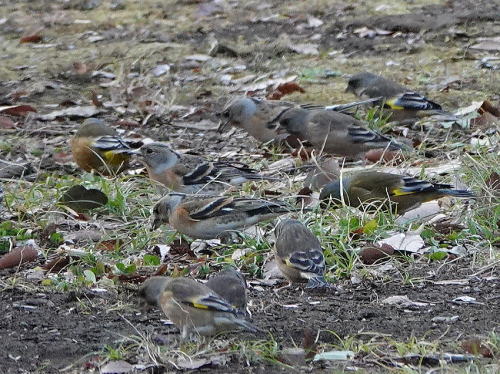 | アトリ[1月1日] 常緑樹の中から水を飲みに下りて来ました。 | アトリ[1月1日] 群れでケヤキの実を食べ始めました。 | |