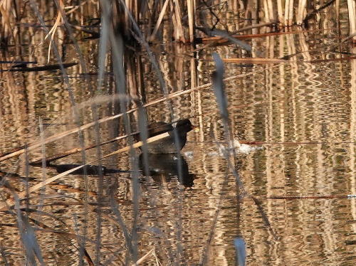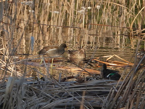 | バン[1月5日] 遠くて見辛いですがガマの穂をぱくぱく食べていました。 | バン、コガモ[1月5日] バンがコガモの群れの中に入って行きました。 | |