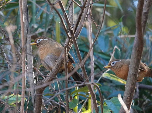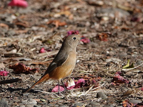 | ガビチョウ[1月3日] 4羽見かけました。あちこち飛んでは茂みに入って行きます。 | ジョウビタキ[1月3日] ツバキの花がぽたぽた落ちてきます。 | |