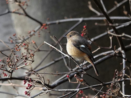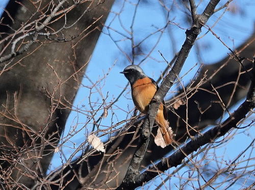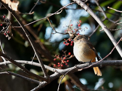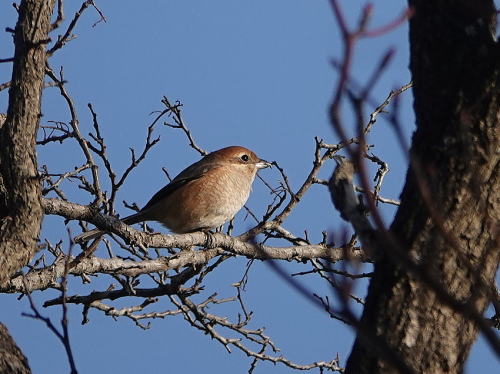 | モズ[1月27日] ♀はよく見かけます。 | ジョウビタキ[1月27日] しきりに上空を気にしていました。 | |