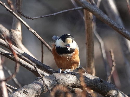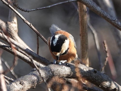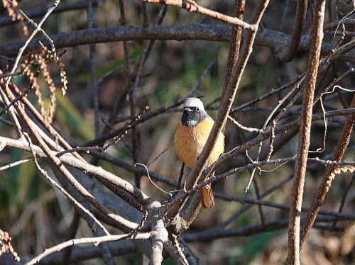 | ジョウビタキ[1月13日] 草地の虫を狙っています。 | ヤマガラ[1月13日] コツコツと音を立てて木の実を突いていました。 | |
