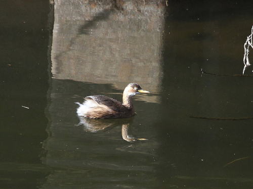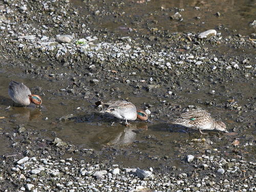 | ツグミ[1月17日] そばを通りかかると赤い小さな実をくわえたままじっとしていました。 | コガモ[1月17日] 採餌に夢中でした。 | |