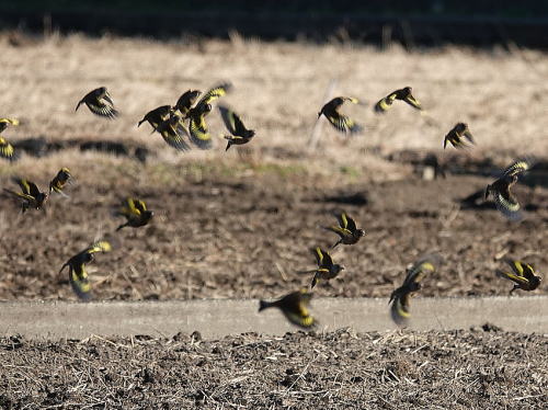 | ノスリ[1月21日] 田んぼの上空を悠々と飛んで行きました。 | カワラヒワ[1月20日] だんだん大きな群れになって来ました。 | |