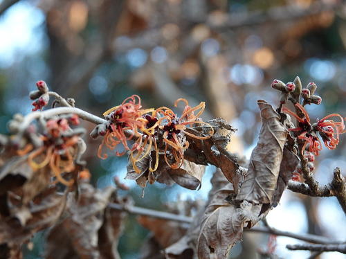 | アトリ、カワラヒワ[1月28日] 群れで採餌中のカワラヒワの中にアトリが3羽混じっていました。 | マンサク[1月28日] 少し春の気配がします。 | |