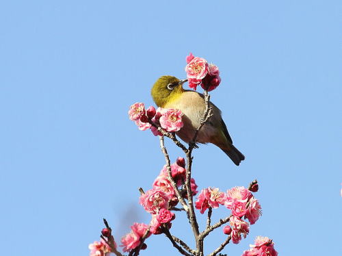 | ハイタカ[1月30日] 田んぼの上空で舞っていました。 | メジロ[1月28日] 夢中で蜜を吸っていました。 | |