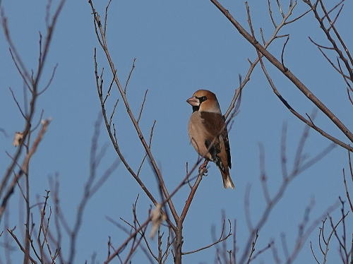 | シメ[1月13日] 高い木の枝先にいました。 | モズ[1月13日] 本日休工の工事現場です。 | |
