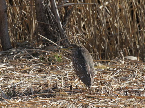 | ゴイサギ[2月1日] 葭原で休憩中です。 | ノスリ[2月1日] 遊水地の上空を飛んで行きました。 |