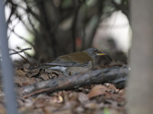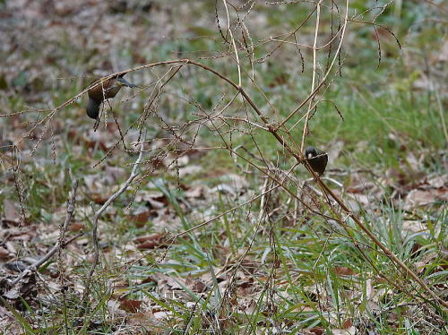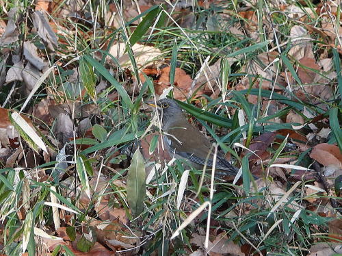 | ウグイス[2月3日] 動き回って姿が見えず、やっと隙間で見えました。 | ツグミ[2月3日] 斜面でガサゴソ、落ち葉の下からミミズを獲っていました。 | |