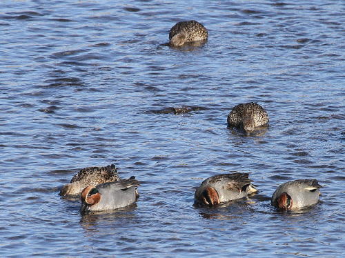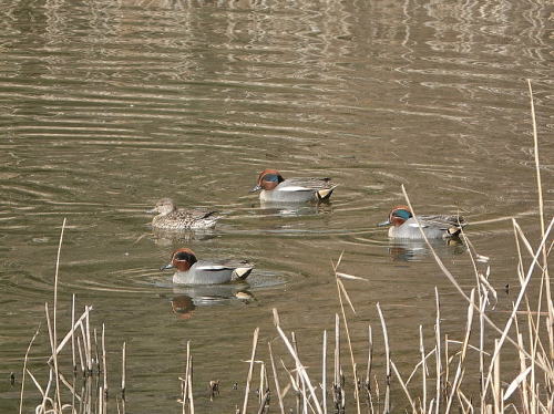| アオジ[2月1日] 河原のヤナギに止まりました。 | コガモ[2月1日] 脇目も振らずに採餌中でした。 | |