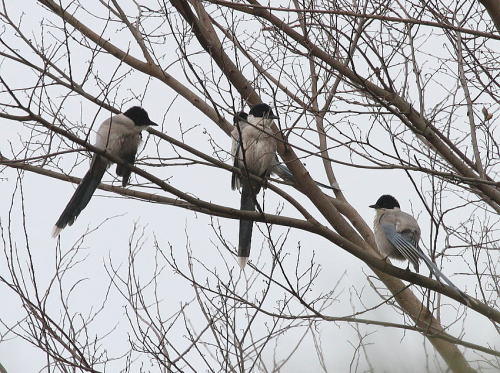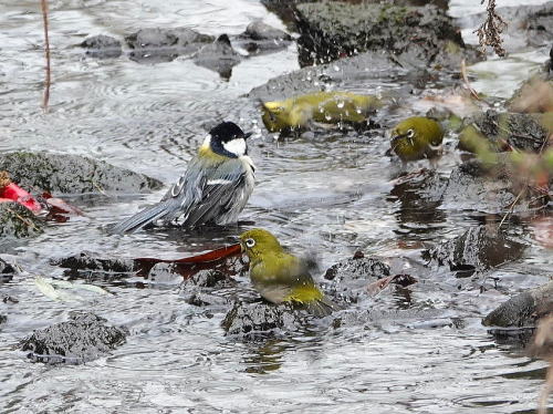 | シジュウカラ、メジロ[2月16日] 公園の前の小川で水浴びです。 | オナガ[2月16日] 20羽位の大きな群れがいました。 | |