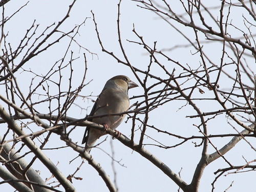 | イカルチドリ[2月3日] 休憩中です。よーく探さないと分からないです。 | シメ[2月3日] 高い木の枝に1羽だけです。 | |