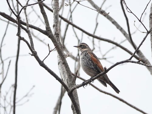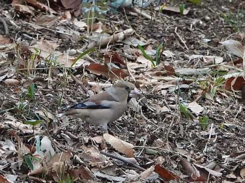 | シメ[2月19日] 葉っぱが動いてないと居るのが分かりません。小さな種を取っていました。 | シロハラ[2月19日] さっと飛び上がりました。 | |