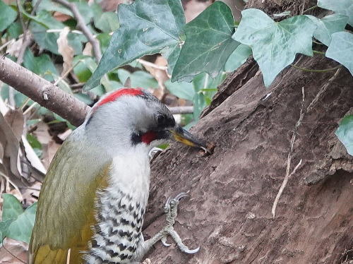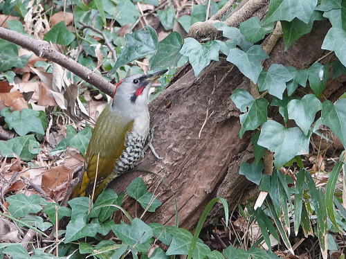 | アオゲラ[3月10日] 木の根元の穴に嘴を差入れ虫を獲っていました。 | アオゲラ[3月10日] 後から♂も姿を見せました。 | |