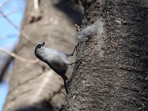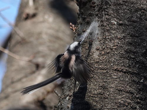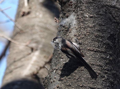 | エナガ[3月9日] 何度も何度も同じ所にやって来ます。 | エナガ[3月9日] よく見るとクモの巣みたいなのを取っています。 | |