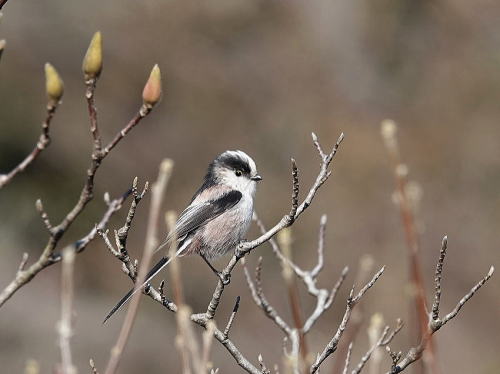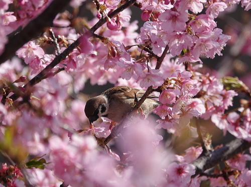 | 河津桜[3月5日] 満開です。あと数年経てば木が大きくなりもっと華やかになるでしょう。 | エナガ[3月2日] 巣作り中だと教えていただきました。ヒナが見られるといいですね。 | |