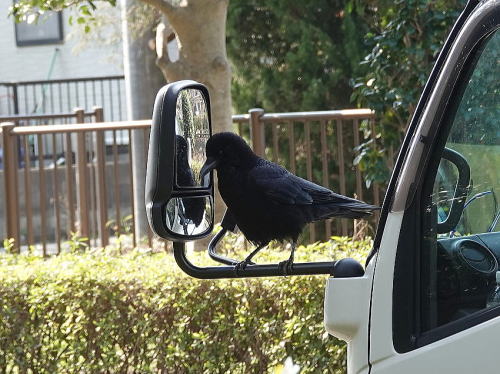 | ルリタテハ[3月15日] 羽をあまり開かずに力なく少し飛んでは止まり、一瞬だけ羽を広げました。 | ハシブトガラス[3月15日] ミラーに映るのは邪魔者だと思ったのか、しつこく突いていました。 | |