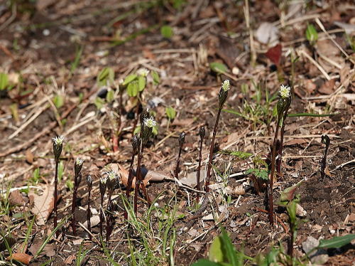 | コガモ[3月31日] 用水路に全部で6羽、3組のペアが採餌中でした。 | ヒトリシズカ[3月31日] 花が開きました。 | |