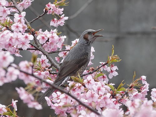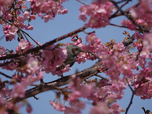 | 河津桜[3月2日] 3分〜8分咲きくらいです。 | ヒヨドリ[3月1日] ヒヨドリが蜜を吸っています。 | |
