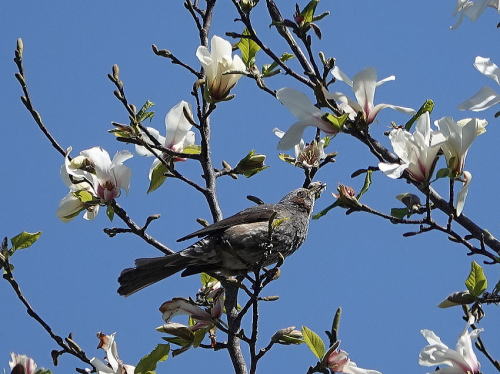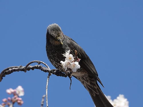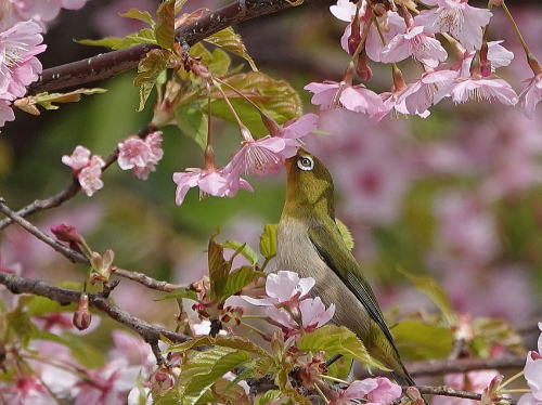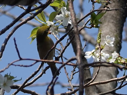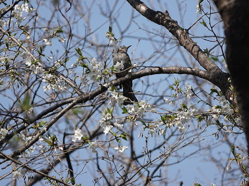 | ヒヨドリ[3月20日] ここ2、3日の暖かさでオオシマザクラは一気に開花が進みました。 | メジロ[3月20日] 高く伸びた枝にメジロもやって来て蜜を吸っています。 | |