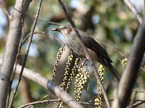 | ジョウビタキ[3月14日] 河津桜は葉桜になりました。 | ヒヨドリ[3月14日] 実のなる桜のようです。雄蕊が長いです。 | |