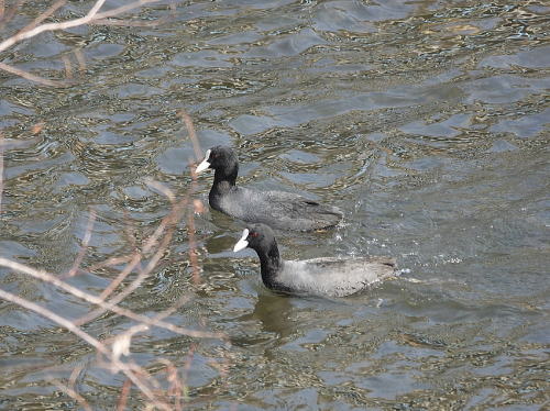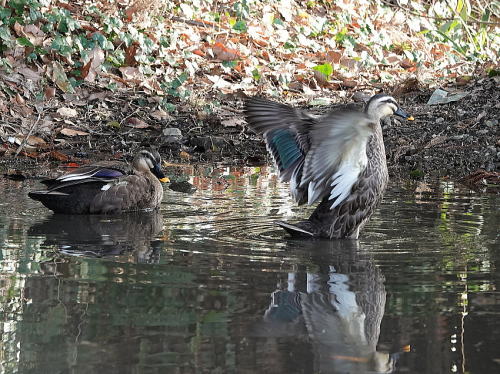 | コゲラ[3月18日] 別の巣穴です。よく見れば頭部にかすかな赤みが見えます。 | カルガモ[3月18日] 今まで1羽でしたが、今日は求愛の声が響いていました。 | |