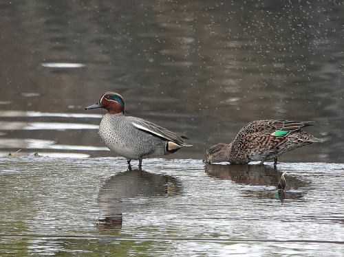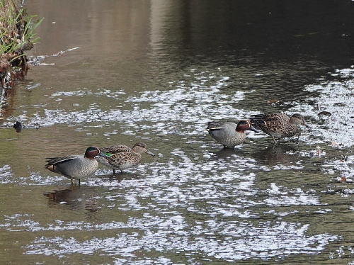 | ヒヨドリ[3月18日] ヒヨドリが啄むたびに、花びらがはらはらと落ちます。 | コガモ[3月17日] いつも♀3羽がいた場所にペアがいました。 | |