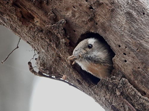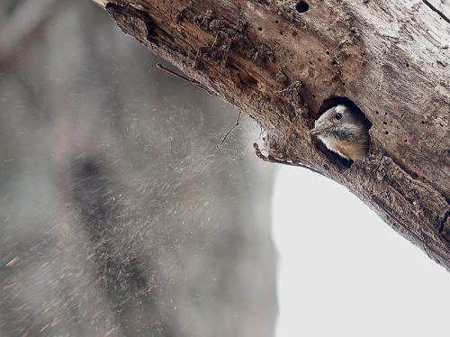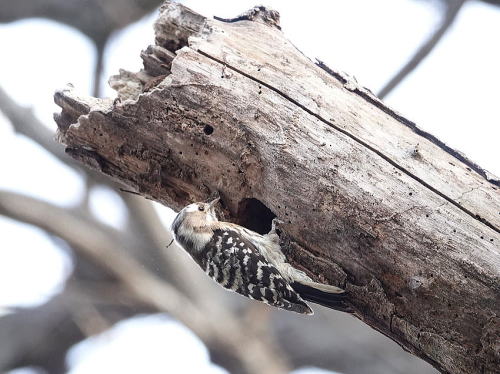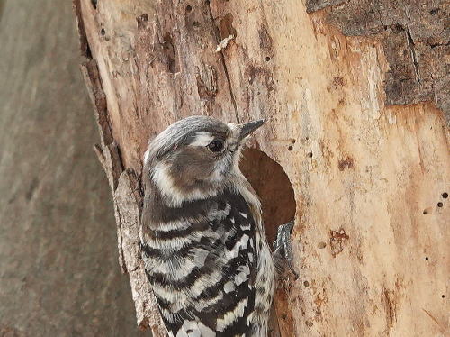 | コゲラ[3月16日] 突いてはせっせと木屑を吹き飛ばしていました。 | コゲラ[3月16日] 完成に近づいたかな? | |