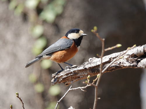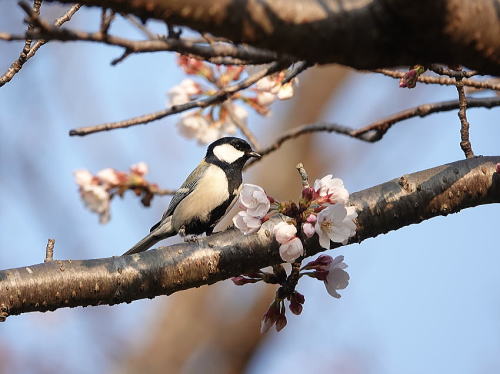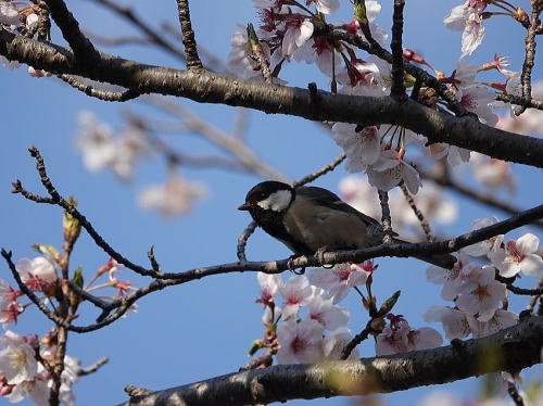 | 桜[3月26日] こちらもまだ2、3分咲きです。 | シジュウカラ[3月26日] シジュウカラが4羽、忙しなく飛び回っていました。 | |