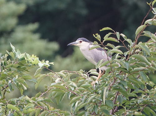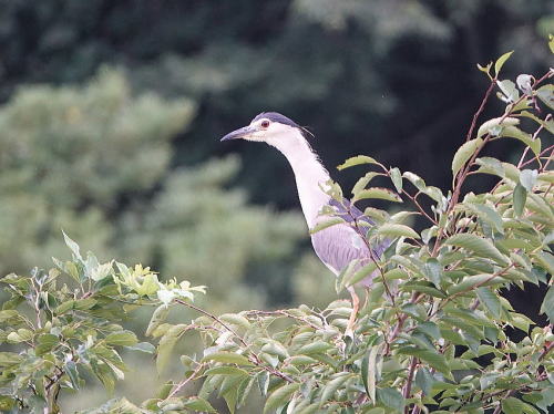 | ゴイサギ[8月6日] 珍しく高い木の上に飛んで来ました。 | ゴイサギ[8月6日] 獲物を探すわけではなく見張りかな? | |