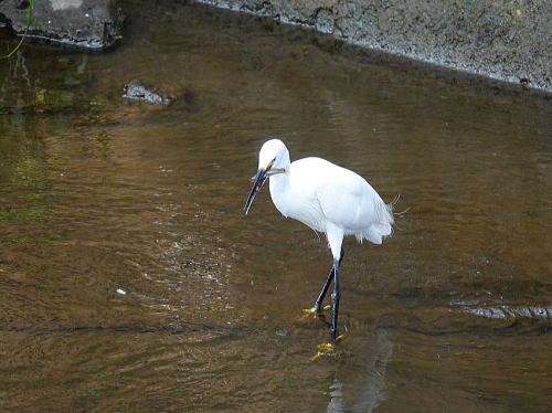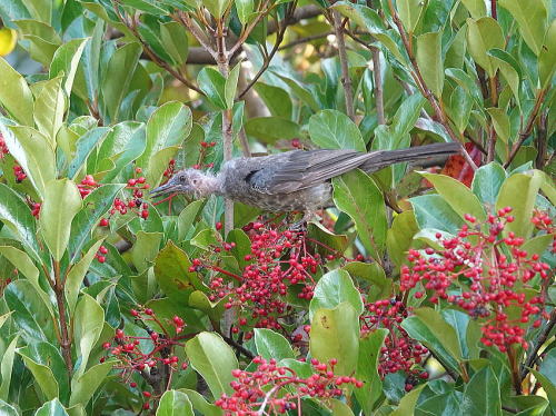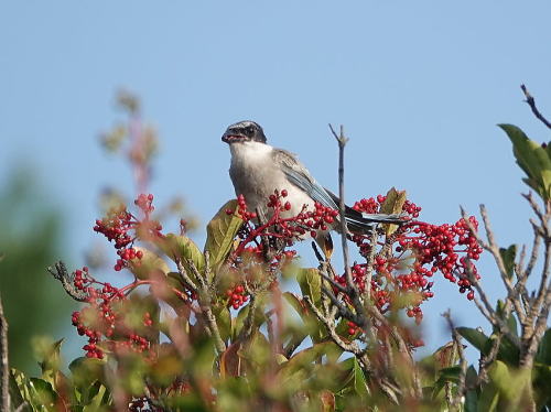 | コサギ[8月25日] 狭くて浅い川ですが、魚は豊富なようです。 | オナガ[8月25日] サンゴジュの実が実りました。幼鳥が食べにやって来ました。 | |