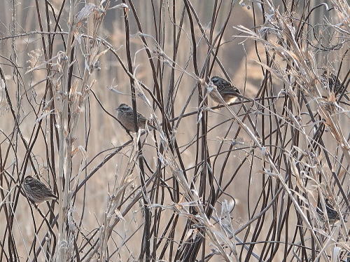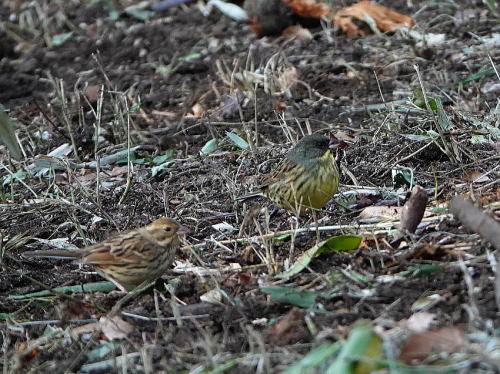 | トビ、ハシボソガラス[2月24日] 食べ掛けていた獲物を狙われてしまいました。 | カシラダカ、ホオジロ[2月24日] 混じっていると分かりにくいです。 | |