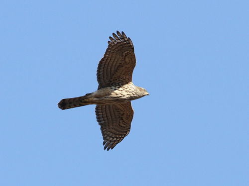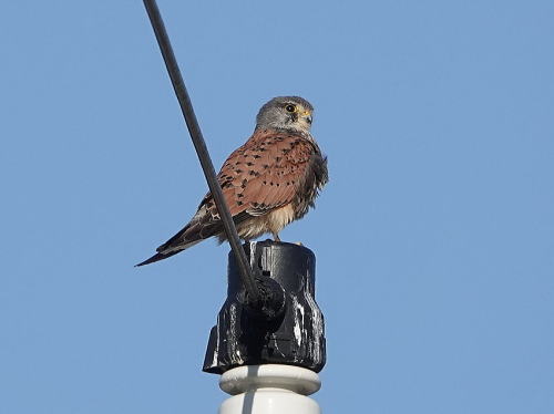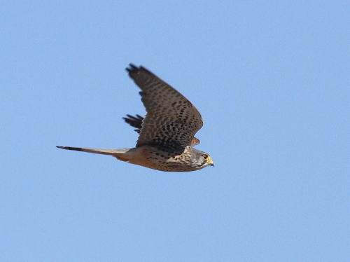 | ノビタキ[2月10日] 遠くて証拠写真ですが、こんな時期にいました。 | チョウゲンボウ[2月10日] 縄張りの上をゆっくりと飛んで行きました。 | |