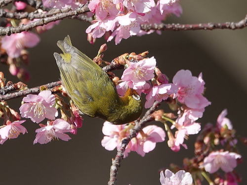 | 河津桜[2月18日] もう八分咲くらいでしょうか。 | メジロ[2月18日] 早速メジロが来ていました。 | |