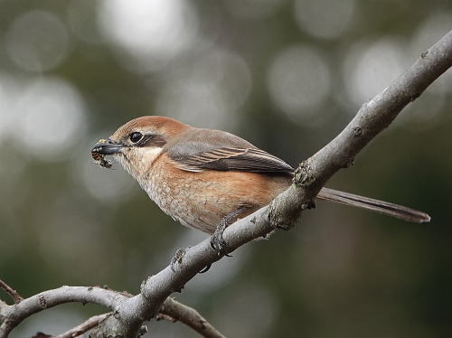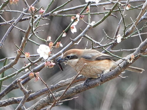| モズ[2月19日] 毛虫を獲りました。 | モズ[2月19日] 続けてアブかハチのような虫を獲りました。 | |