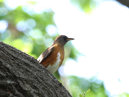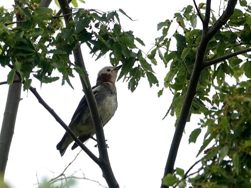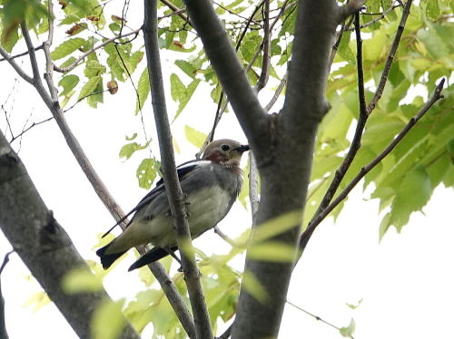 | コムクドリ[5月3日] 川沿いの小さな公園にいました。 | コムクドリ[5月3日] 一番高い木の茂った中に居るので見えないです。 | |