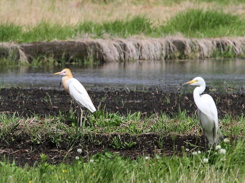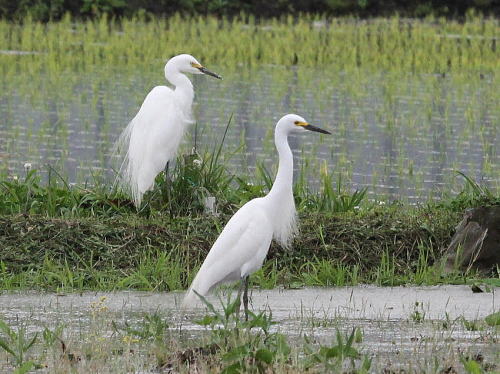 | コチドリ[5月13日] 水が張られた田んぼの畦で休憩中です。 | アマサギ、チュウサギ[5月13日] チュウサギは2羽いました。 | |